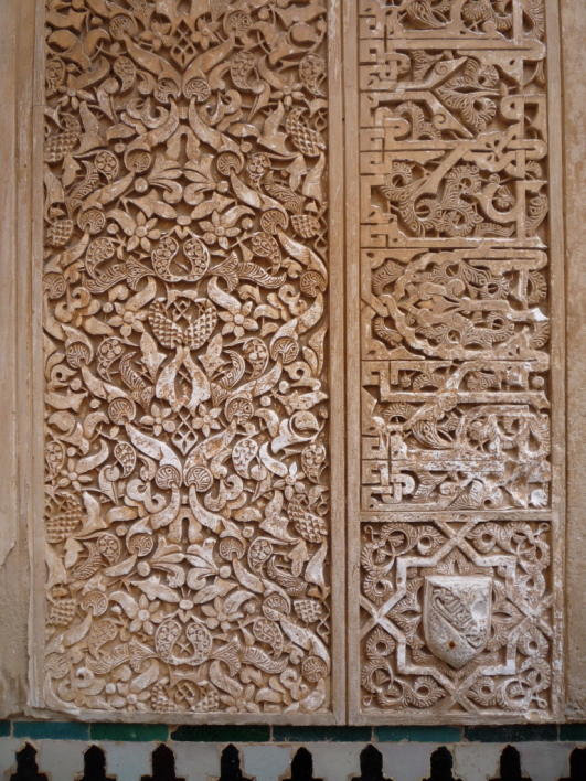 | ← コマレスの塔は見事。見所も多い 透かし彫りの向こうの風景もgood その内部のアラベスク模様は圧巻↓ 文様は、可視的物質世界を超えて広がる無限のパターンを構成し、創造主の理想郷の世界を創出しているのだろう。美しい。 文字のコーランも彫ってある。 |