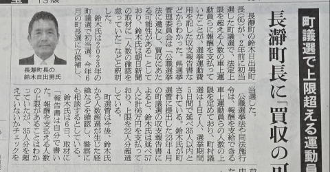 2025年11月朝日新聞 二年前の町長選で選挙違反があったようです。