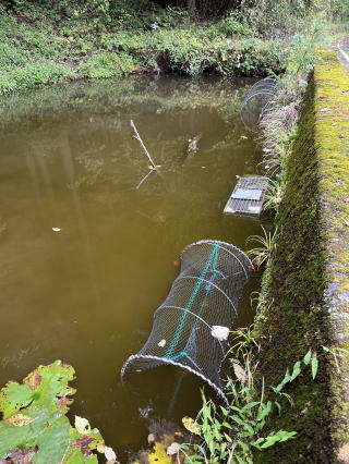 2021/7/22 誰かがこの池に放した鯉をつかまえるべく有志が集まった。 鯉に食べられてモリアオガエルのオタマジャクシは一匹も見つからなかったのです。 この日は大きな鯉五匹捕獲。その後も小さな鯉は捕獲を計画。緋鯉などはお寺さんの池へ引き取って頂けた。
