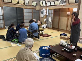 3月26日奈倉展招待状発送作業 妙見様(正副区長、文庫担当楠さんと行事)この時はつまみと飲み物を用意。