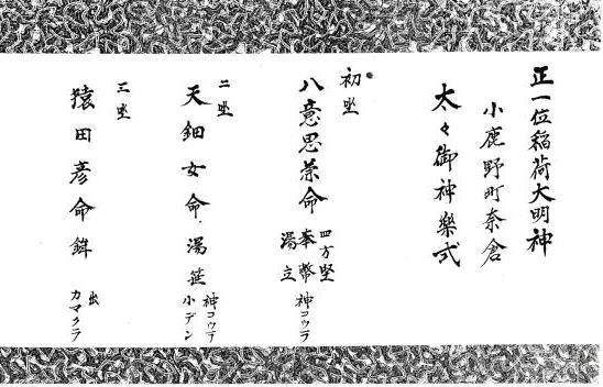 正一位稲荷大明神 小鹿野町奈倉 太々御神楽式 初座 八意思兼命 二座 天鈿女命 三座 猿田彦命 |