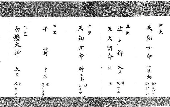 四座 天鈿女命 五座 袚戸神 天火明命 六座 天鈿女命 七座 千箭 八座 白鬚大神 |