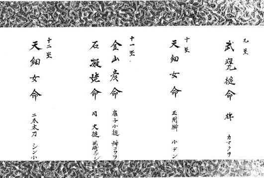 九座 武甕槌命 十座 天鈿女命 十一座 金山彦命 石凝姥命 十二座 天鈿女命 |