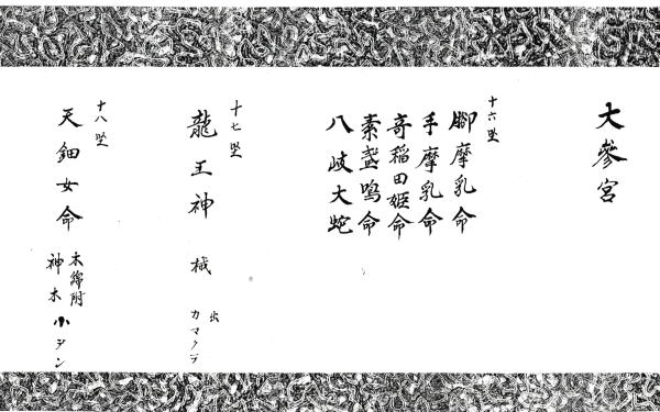 十九座 大巳貴命 二十座 武三熊 二十一座 天鈿女命 二十二座 大山袛命 二十三座 事代主命 石凝姥命 |