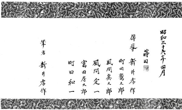 昭和26年4月 蒔田 傳導 新井孝作 町田鷲太郎 風間眞太郎 風間定一 富田房太郎 町田和一 筆者 新井孝作 |