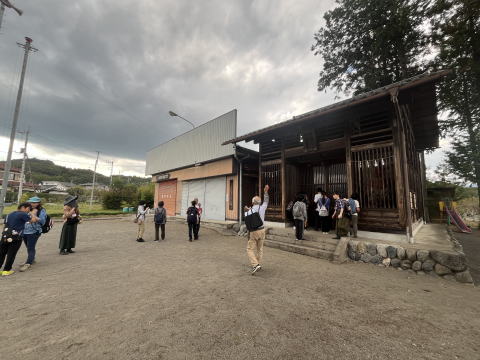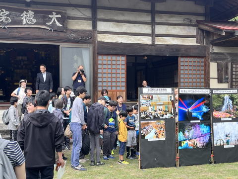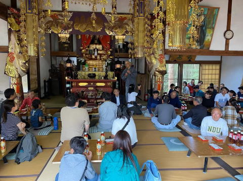 ↑ 一団が到着しパネル展示で山口清文氏が小鹿野を紹介。 家族連れも多い43人。 大徳院の中でわらじカツで昼食 方丈挨拶 → 団体さんは2組に分かれて「あじさい神社」と「館跡公園」へ |