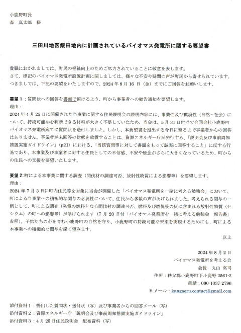 バイオマス発電所を考える会の要望書を町長へ提出 メンバー3名で出席し約30分にわたり説明とともに要望書への思いを伝えました ⇒この日のことが新聞の記事になりました。 提出した内容は↓ 8月16日までに回答をお願いしました。