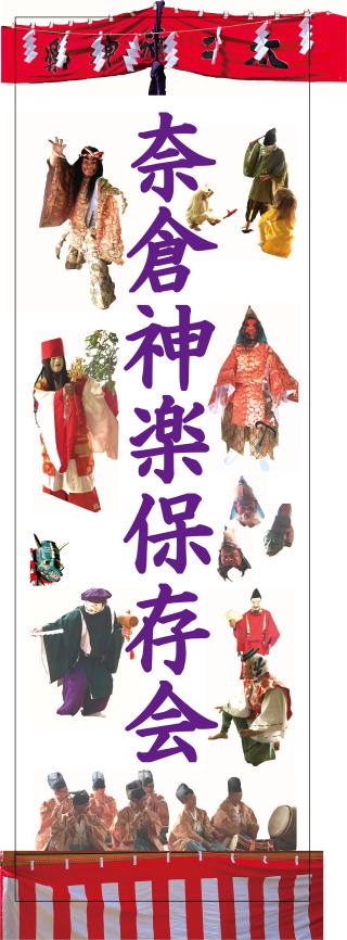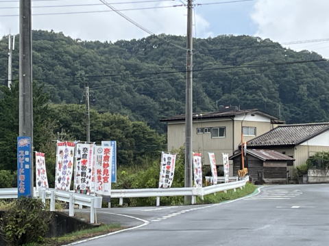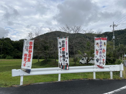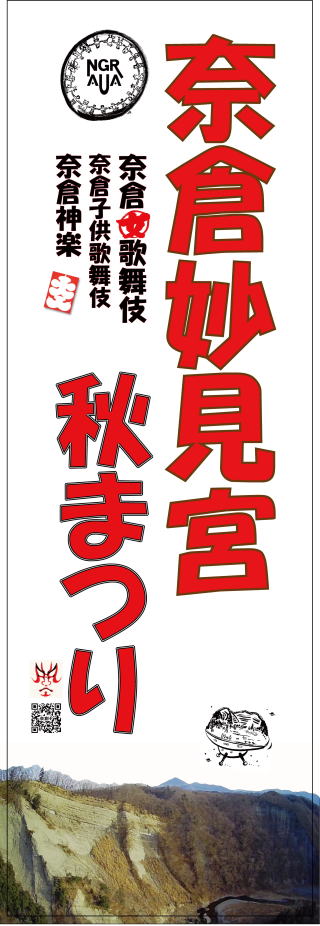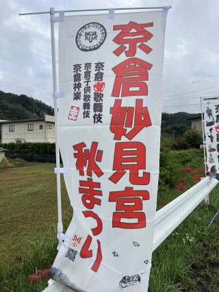 祭りを盛り上げるためにのぼり旗を作りました。早速妙見様の前に設置