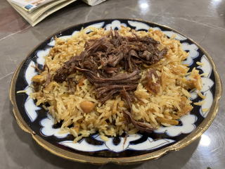 遠いバス停まで歩くとレストランを見つけた。ちょうど探していたピラフの原型プロフのお店だ。竈の上の巨大な鍋で羊や牛肉を骨付きでオイル蒸した中へスパイスや野菜が混ぜられてまた蒸す。太っちょのオヤジが作り娘が配膳する。かなり美味。ナンやサラダ、チャイもセットで3万5千スム(四百六十円)