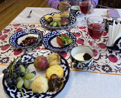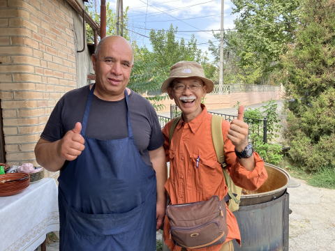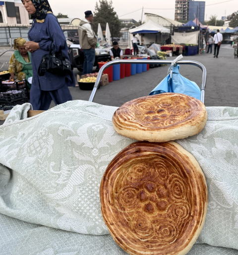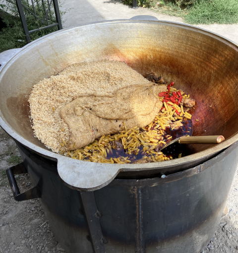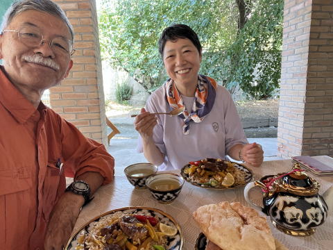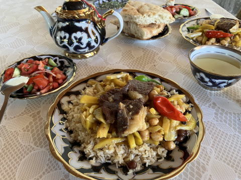 ![]() プロフのセット サマルカンドの博物館から数kmのところ 凄く うまい!! サラダ、ナン、チャイのセットで35000スム(ざっと460円) |