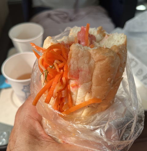 チキンサンドといって 特急電車で売りに来た。 お肉よりニンジンの千切りがたくさん入っていた。 |